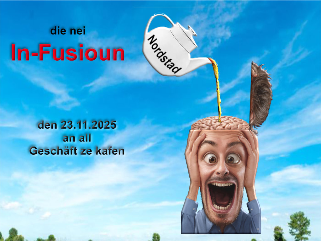Ech ka mir net virstellen dat een sech en Haus bauen léisst, an dann duerno mam Architekt de Plang besprecht wéi Haus duerno soll ausgesinn a wéi eng Stécker Buedem ee muss kafen vir ze bauen, dat ass dat watt Nordstad-Fusioun ass,funn de Féiss op de Kapp gestallt.Et ass alles rouig bis op emol een erem Eppes héiert,awer all déi Stécker vum Puzzel ginn kee ganzt Bild.