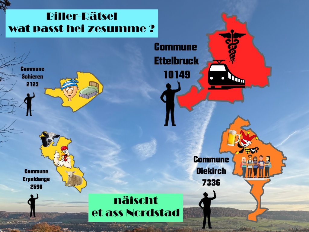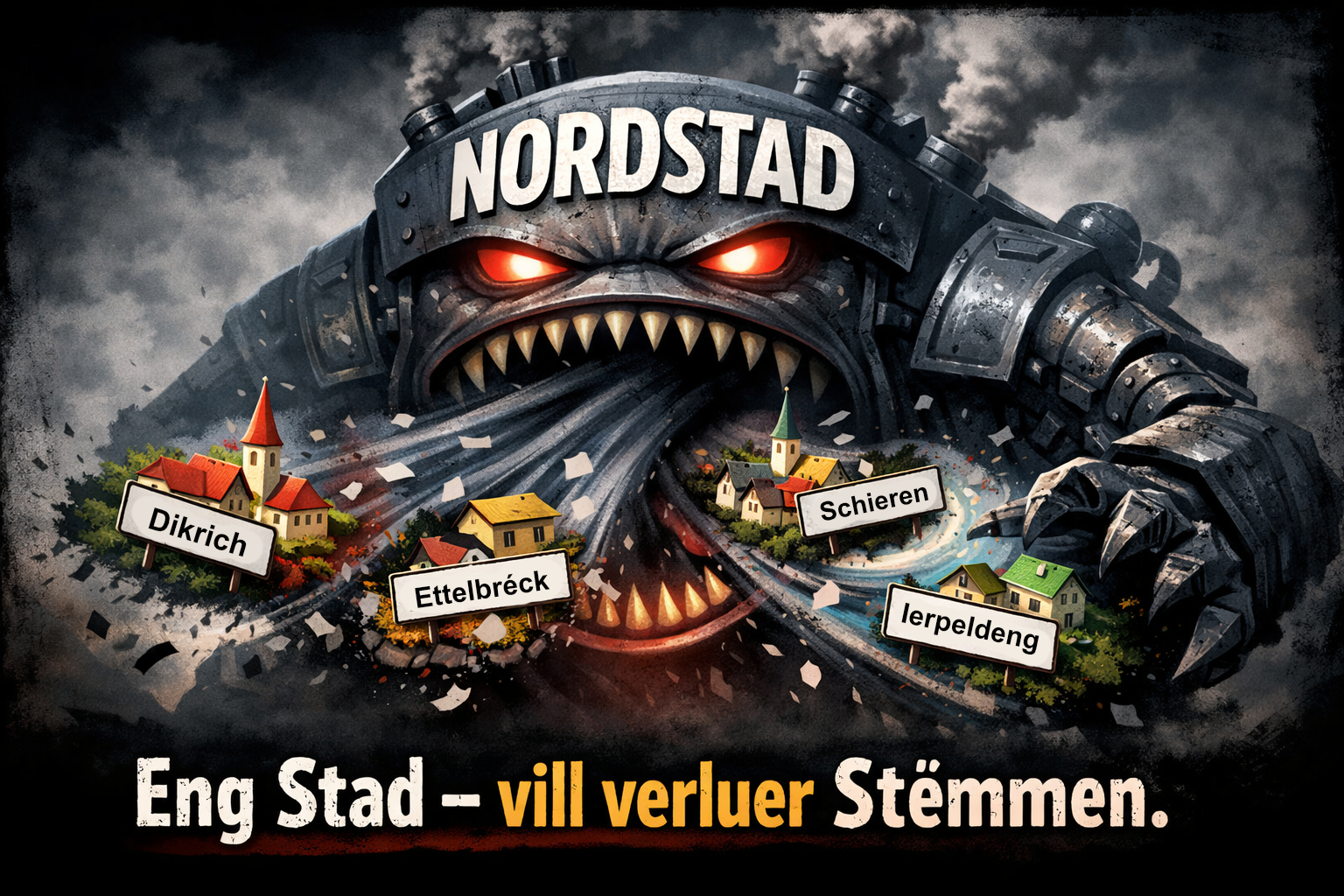 Ech ka mir net virstellen dat een sech en Haus bauen léisst, an dann duerno mam Architekt de Plang besprecht wéi Haus duerno soll ausgesinn a wéi eng Stécker Buedem ee muss kafen vir ze bauen, dat ass dat watt Nordstad-Fusioun ass,funn de Féiss op de Kapp gestallt.Et ass alles rouig bis op emol een erem Eppes héiert,awer all déi Stécker vum Puzzel ginn kee ganzt Bild.